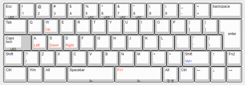 60% WK 배열에 방향키랑 iso배열이랑 3u 스페이스바 2개까지..... 넣을 수 있는걸 전부 우겨넣었고 입을 다물게 하는 배열이다.....